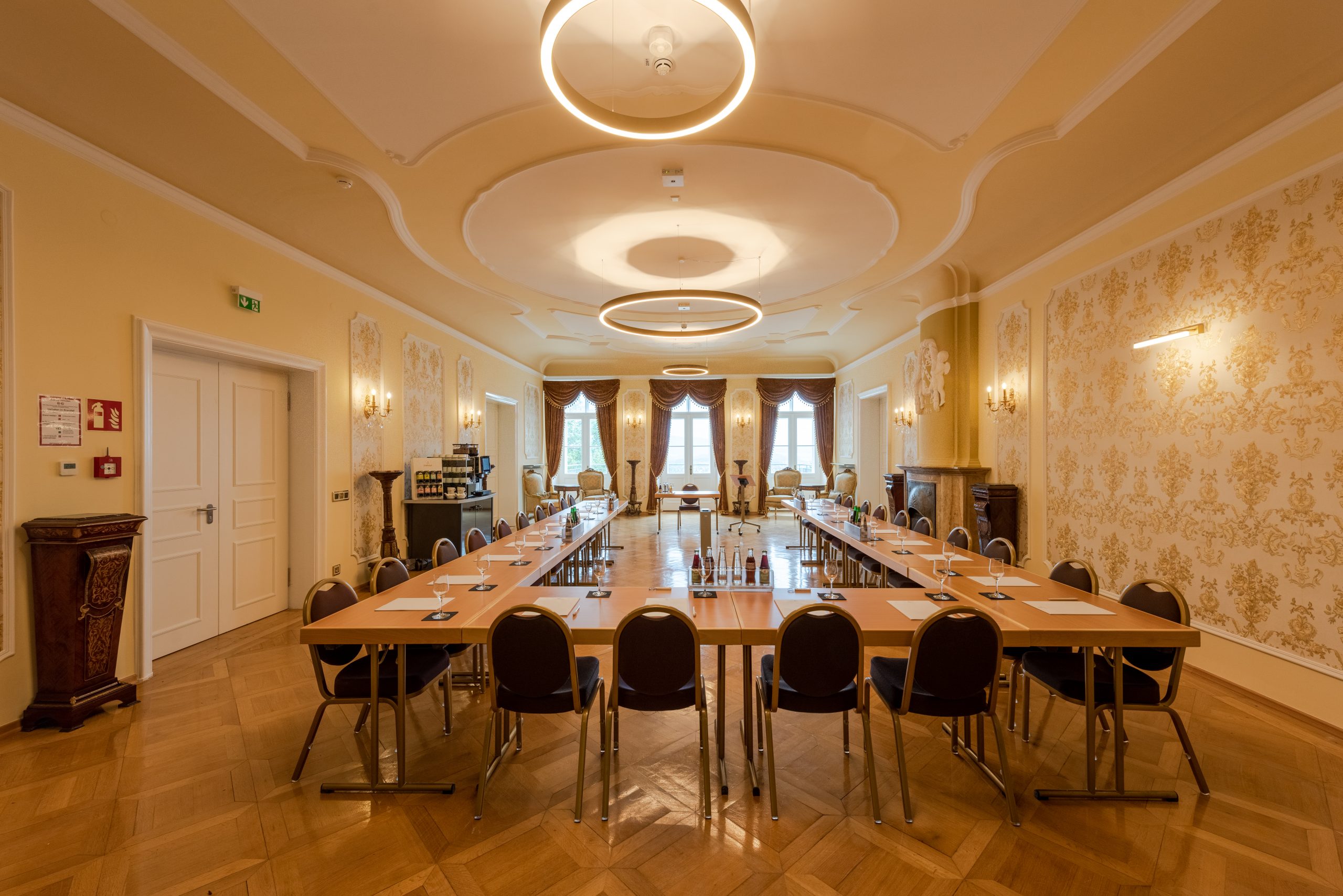 Ein Traum aus blau ist unser 53 m² großer Raum Prag. Besprechungen und Veranstaltungen in kleinem, aber prunkvollen Rahmen finden hier das perfekte Ambiente.