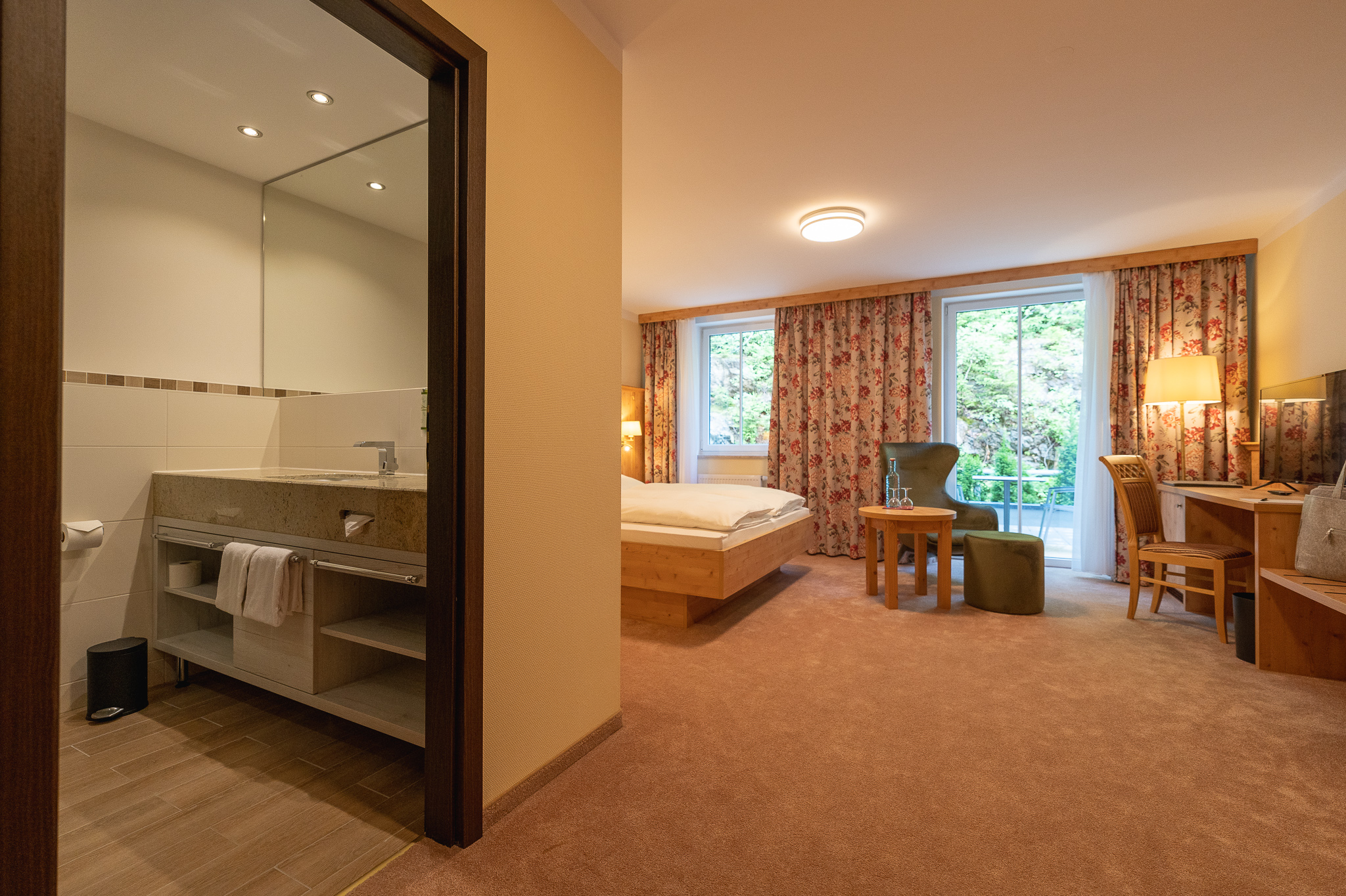 Unsere geräumigen Doppelzimmer lassen keine Wünsche übrig. Sie verfügen über große Doppelbetten mit getrennten Matratzen, eine Minibar, Sitzecken und große Schränke, die genügend Stauraum für einen ausgedehnten Urlaub in unserem Haus bieten. Außerdem sind viele Zimmer mit Balkon, Terrasse oder Sitzecken ausgestattet. Genießen Sie also den herrlichen Ausblick auf das Zwieseler Tal oder den hoteleigenen Forst. Die großzügigen Badezimmer verfügen über einen großen Waschtisch, der viel Stauraum bietet, eine Dusche oder eine Badewanne, einen Haartrockner und einen beleuchteten Schmink- und Rasierspiegel. Flauschige Bademäntel und hochwertige Pflegeprodukte runden die Badezimmerausstattung ab.