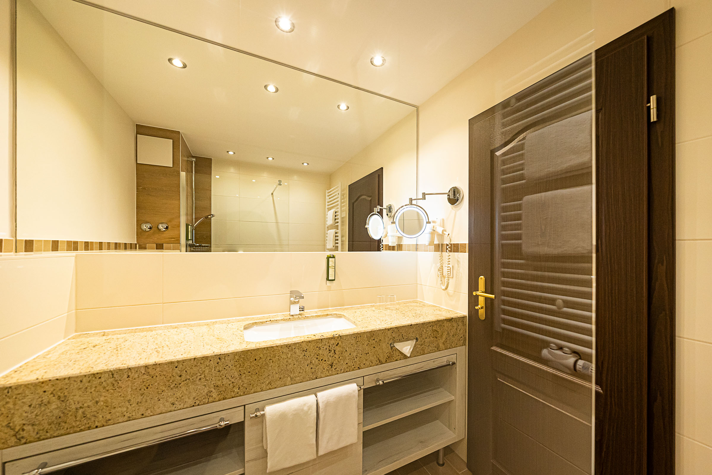 Our spacious double rooms leave nothing to be desired. They have large double beds (180×200 cm) with separate mattresses, a minibar, sitting areas and large closets that provide enough storage space for an extended vacation in our house. In addition, many rooms are equipped with a balcony, terrace or sitting corner. So enjoy the magnificent view of the Zwiesel valley or the hotel’s own forest. The spacious bathrooms have a large vanity that offers plenty of storage space, a shower or a bathtub, a hairdryer and an illuminated make-up and shaving mirror. Fluffy bathrobes and high-quality toiletries round out the bathroom amenities.