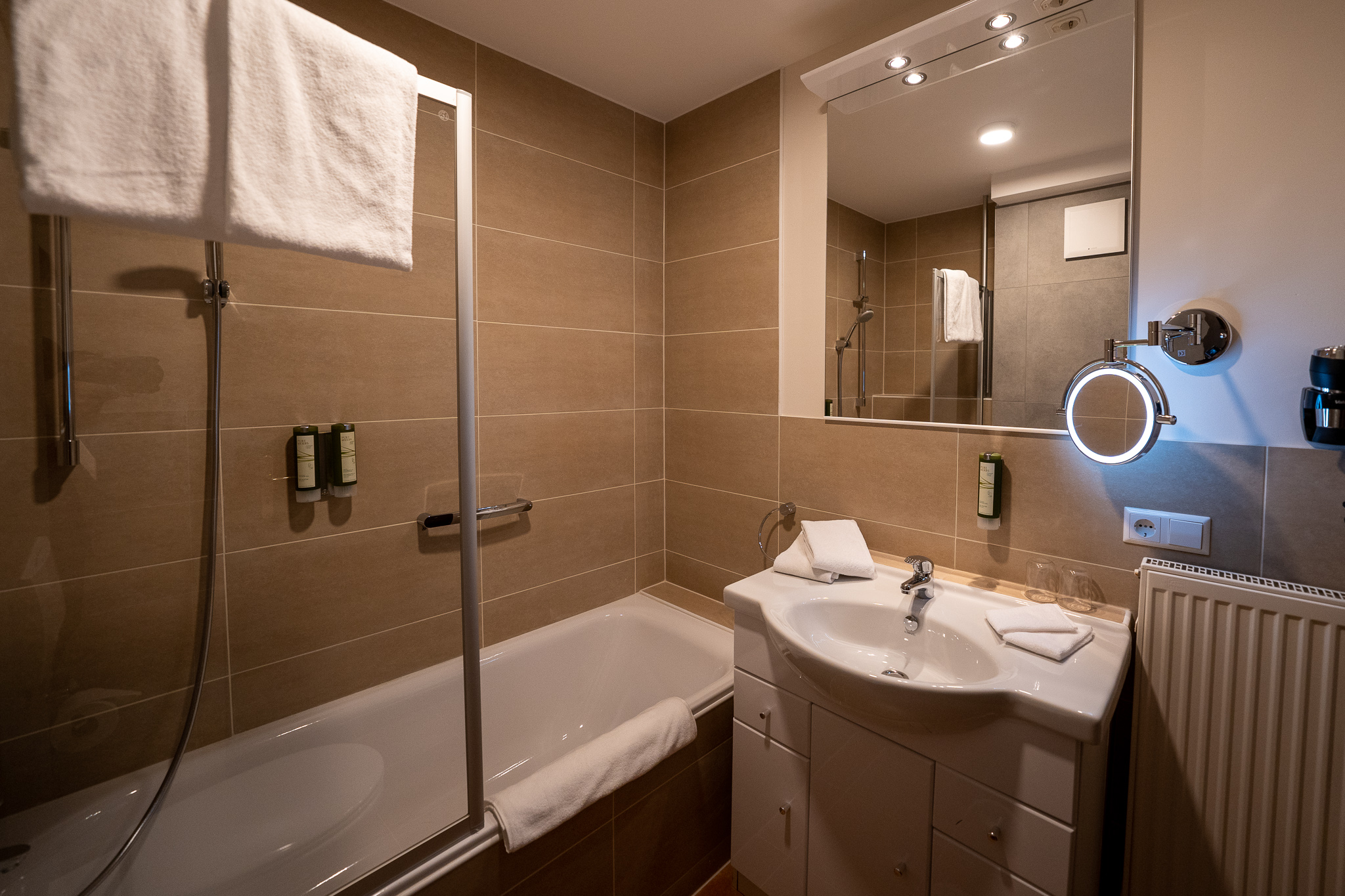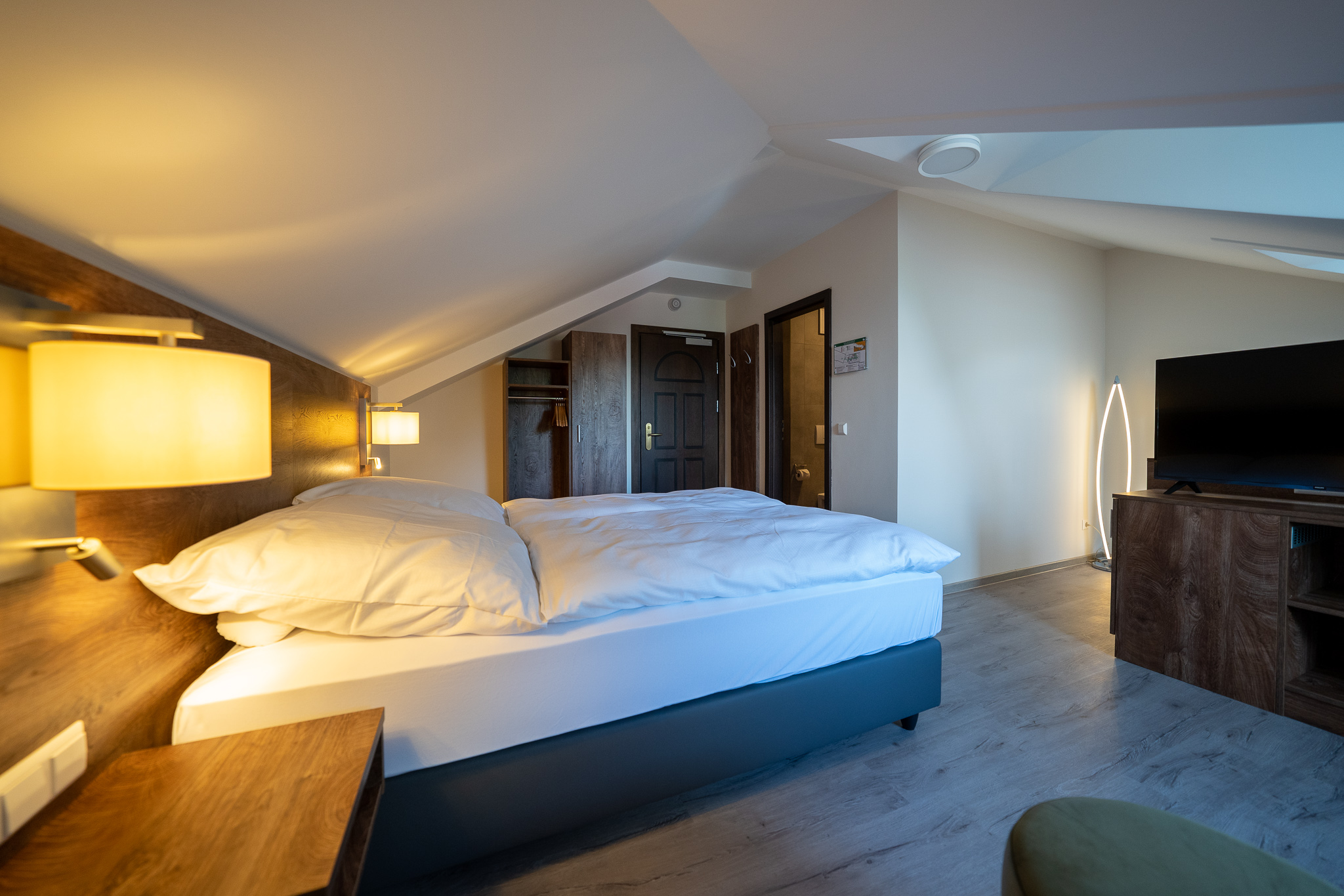 Packen Sie ihr kleines Gepäck und los geht es für eine kurze Auszeit in den bayerischen Wald. Hierfür eigenen sich unsere Junior-Doppelzimmer perfekt. Das Zimmer bietet Ihnen allen Komfort, den es für Ihren Kurztrip braucht. Die Zimmer sind mit bequemen Queensize Doppelbetten (160×200 cm), Minibar und modernen TV-Schreibtisch Kombinationen ausgestattet. Die neuen Badezimmer haben eine Dusche, einen beleuchteten Schmink- und Rasierspiegel und sorgen mit dem großen Waschtisch für genügend Stauraum. Für Ihren Abstecher in den entschleunigenden Wellnessbereich liegen flauschige Bademäntel und Ihre persönliche Saunatasche bereit.